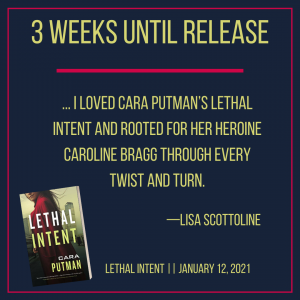 “I loved Cara Putman’s LETHAL INTENT and rooted for her heroine Caroline Bragg through every twist and turn. This legal thriller perfectly captures what it’s like to grow from law clerk to lawyer, and when Caroline finds herself faced with a heartbreaking ethical dilemma that leads to the corporate battle of her life, she confronts the challenge with strength and resources she never knew she had. Putman seamlessly blends the story with a wonderfully inspiring romance, too. Do yourself a favor and pick up a copy of LETHAL INTENT!” Lisa Scottoline
