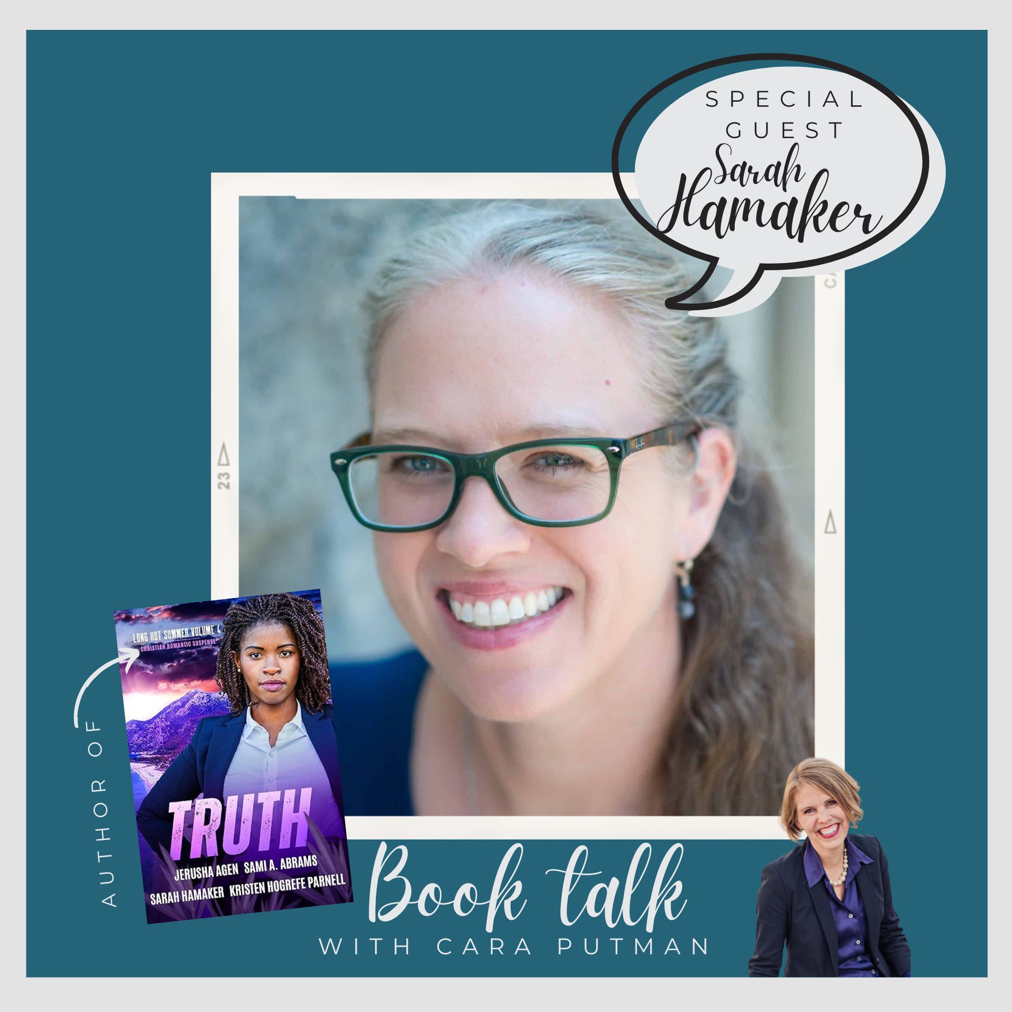 For today’s episode of Book Talk, I’m so pleased to introduce you to Sarah Hamaker. On her website, Sarah hosts quick takes with authors, a great way to learn about what authors are working on and their newest books (you can listen to my part in one recent episode here). In addition to encouraging and supporting other authors, Sarah writes page-turning romantic suspense. She has a novella in the Truth collection, and it’s one you won’t want to miss.