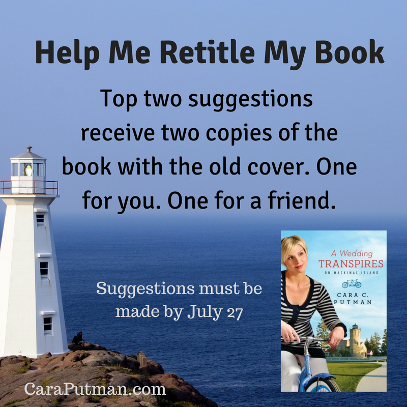 The ideas are in. Help @cara_putman select the winning title. #amreading #helpanauthor Click To Tweet You know me. You know my writing. So I need your help. And because I’m grateful for your amazing ingenuity and inspiration, I’m running a giveaway, but will also sell my in stock copies of A Wedding Transpires on Mackinac Island for $4 plus $3.00 …