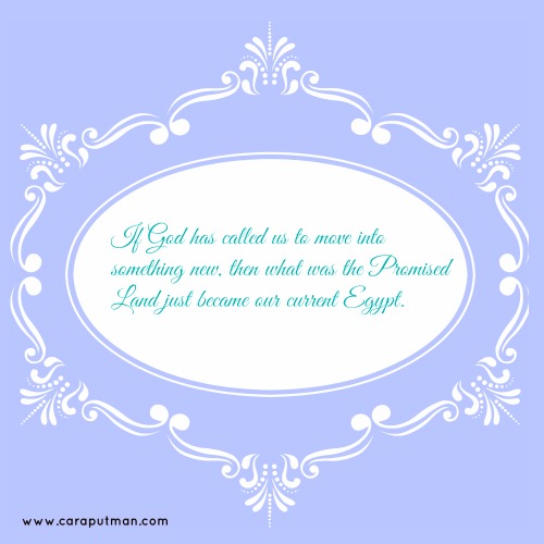 If God has called us to move into something new, then what was the Promised Land just became our current Egypt. When I realized that a couple weeks ago, it hit me square between the eyes. How many times have I said, but this is where God wanted me…to keep from moving forward.